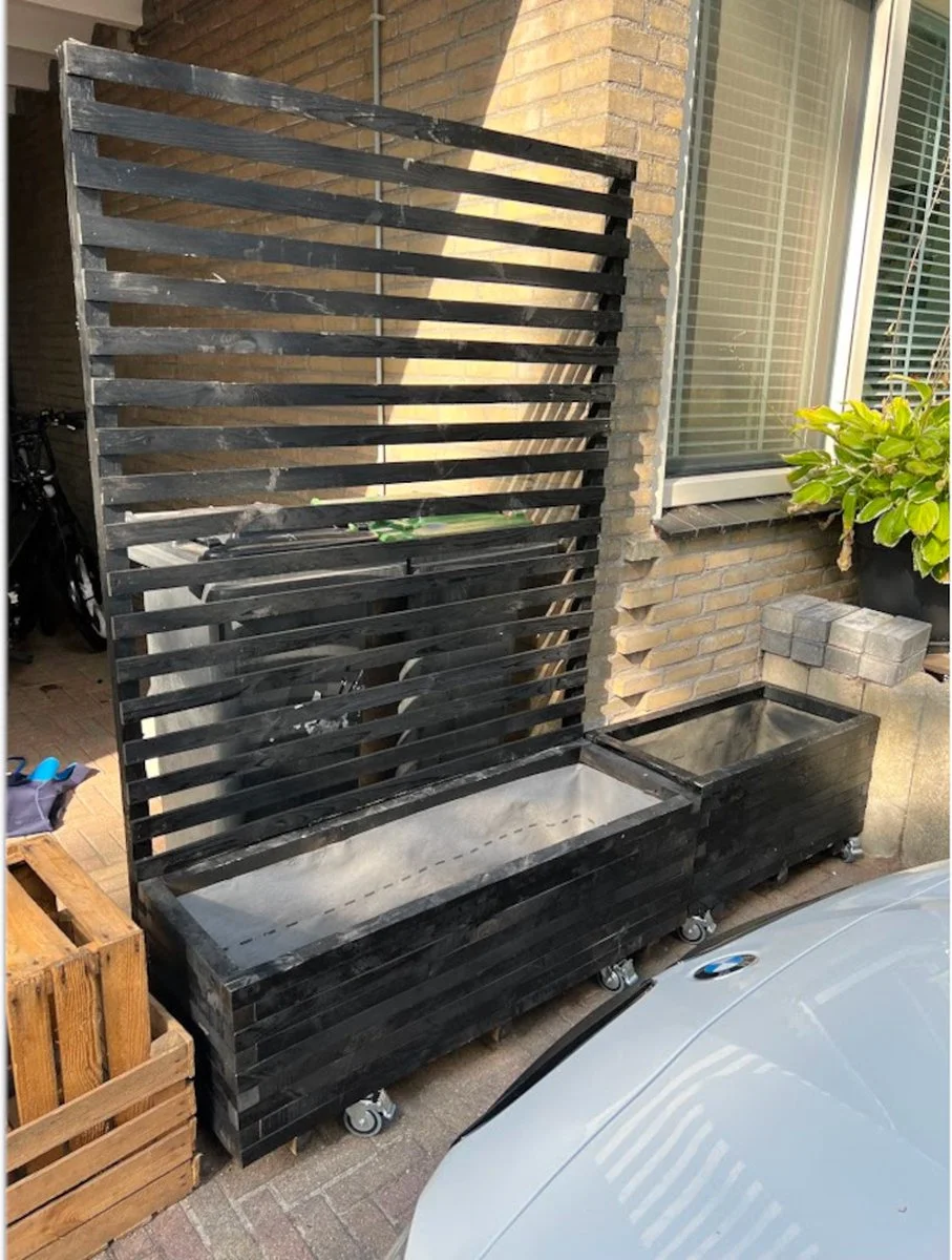 Afmetingen: plantenbak 120 x 40 x 40 cm + klimrek 120cm lang en 180 cm hoog.