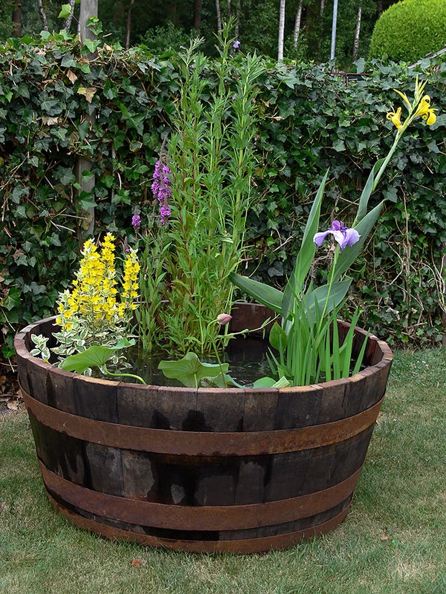 Kuip hand gemaakt van een 240 ltr Whiskyvat. De “Whisky” is gemaakt van vaten die door weer en wind op een natuurlijke manier zijn verouderd. Al onze kuipen zijn gemaakt van gebruikte eiken vaten die jarenlang hebben bijgedragen aan de rijping van wijn of whisky.