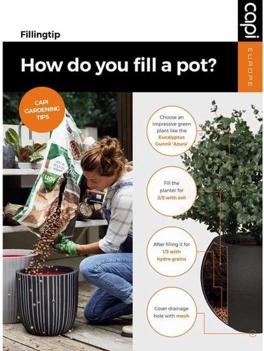 Deze duurzame bloempot uit de Capi Nature Rib NL collectie is CO2 neutraal geproduceerd en gemaakt met gerecyclede materialen. De oranje binnenkant van de pot is een knipoog naar de Nederlandse productie en tevens een isolatielaag die de potten beschermt tegen vorst in de winter en hitte in de zomer. Deze extra laag zorgt ook voor meer stevigheid, waardoor deze pot breukbestendig is. De pot is geschikt voor indoor en outdoor gebruik en beschikt over een levenslange garantie.
