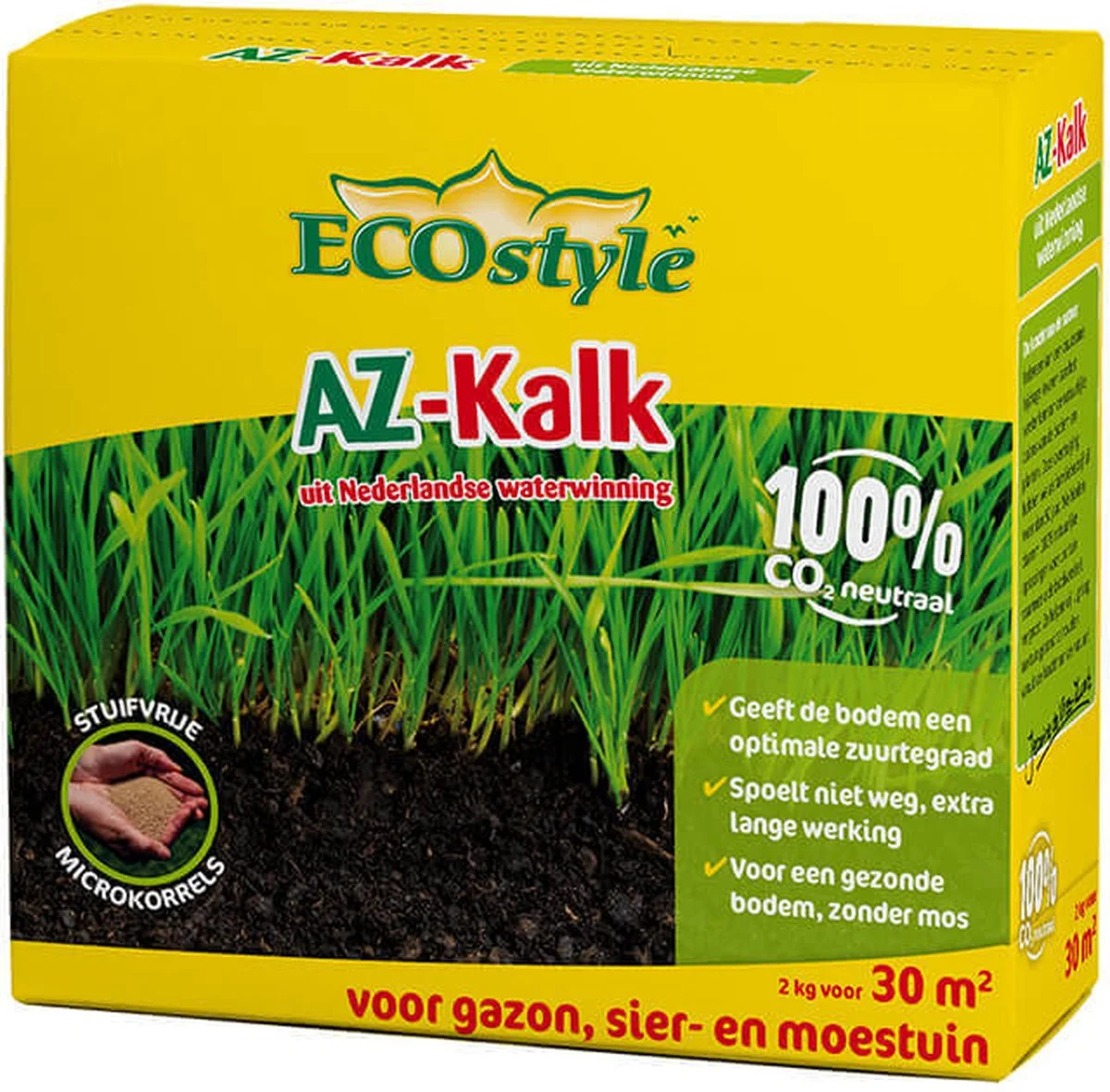 AZ-Kalk is 100% natuurlijk. De kalk wordt volledig CO2-neutraal verkregen vanuit Nederlandse waterwinning, waarbij geen kalkgroeves of andere natuurgebieden worden afgegraven. De restuitstoot van CO2 binnen de keten compenseert ECOstyle.