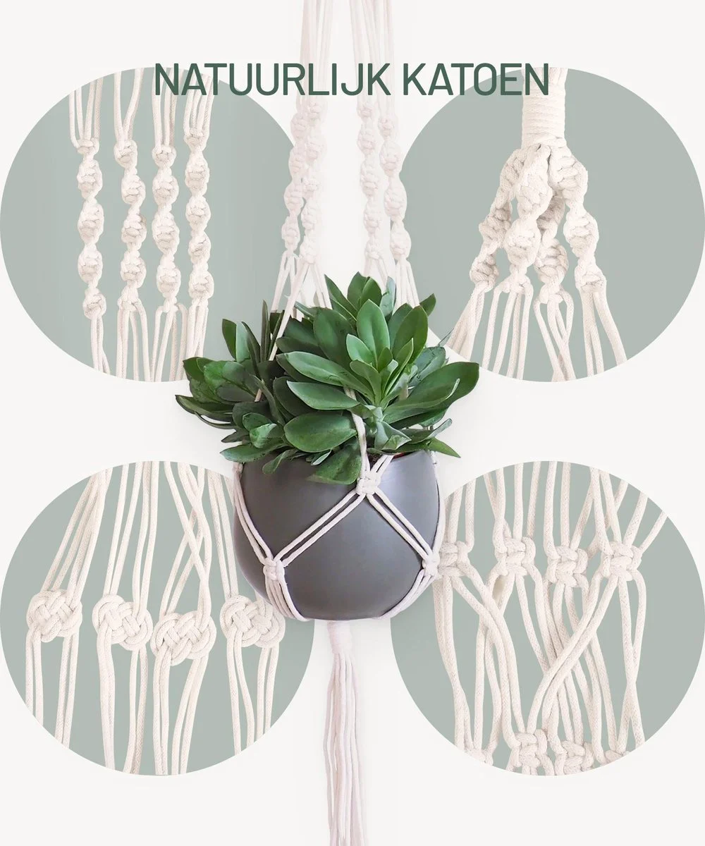 Handgeweven – deze plantenhangers bestaan uit handgeweven katoen in macramé stijl. Super hip op dit moment!
