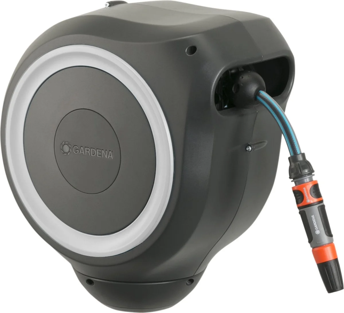 Tuinieren is handiger en gemakkelijker dan ooit met de wandslangenbox RollUp S. Deze helpt uw tuin netjes en opgeruimd te houden en voorkomt hinderlijk struikelgevaar als gevolg van een rondslingerende slang. De praktische slangopslag is eenvoudig aan de muur van uw huis te bevestigen en wordt met een flexibele aansluitslang aangesloten op de kraan. Dankzij de stevige muurbeugel kan de slangenbox meer dan 180 graden worden gedraaid, zodat u elke hoek van uw tuin moeiteloos kunt bereiken. Voor direct gebruik kunt u de tuinslang eenvoudig verlengen tot een lengte van maximaal 15 meter. De tuinslang wordt automatisch in heel korte intervallen vergrendeld zodra u stopt, wat betekent dat de slang eenvoudig en gemakkelijk te hanteren is. Door lichtjes aan het uiteinde van de slang te trekken, wordt de vergrendeling ontgrendeld en een ingebouwde stalen veer met innovatieve RollControl-technologie zorgt voor soepel en gecontroleerd oprollen. De RollControl beschermt de slangenbox en de omgeving tegen schade als gevolg van het te snel inrollen. Om knikken of knopen in de slang te voorkomen, heeft de box een geïntegreerde slanggeleider. Dankzij de slang- en kraanaansluitingen van het Original Gardena System kunt u eenvoudig en flexibel een verlengstuk of ander compatibel Gardena element op de slang aansluiten. U hebt altijd uw Gardena slangopzetstukken bij de hand. Ze kunnen onder de muurbeugel worden bevestigd en daar worden opgeborgen om ruimte te besparen. De Gardena wandslangenbox is UV- en vorstbestendig en kan het hele jaar door probleemloos aan de muur van het huis blijven bevestigd. Het hoogwaardige materiaal biedt u een lange levensduur en gebruiksgemak zonder onderhoud. Bovendien kan de box niet worden gestolen dankzij de antidiefstalbeveiliging en kan de box alleen door u van de muur worden verwijderd. Samen met de wandslangenbox ontvangt u een muurbeugel, een flexibele aansluitslang, alle benodigde Original Gardena System en montageonderdelen en een mondstuk met twee verschillende sproeiopties. Dit hoogwaardige product wordt geleverd met een garantie van vijf jaar van Gardena. Bewatering die altijd gebruiksklaar is , dankzij de GARDENA wandslangenbox RollUp S.