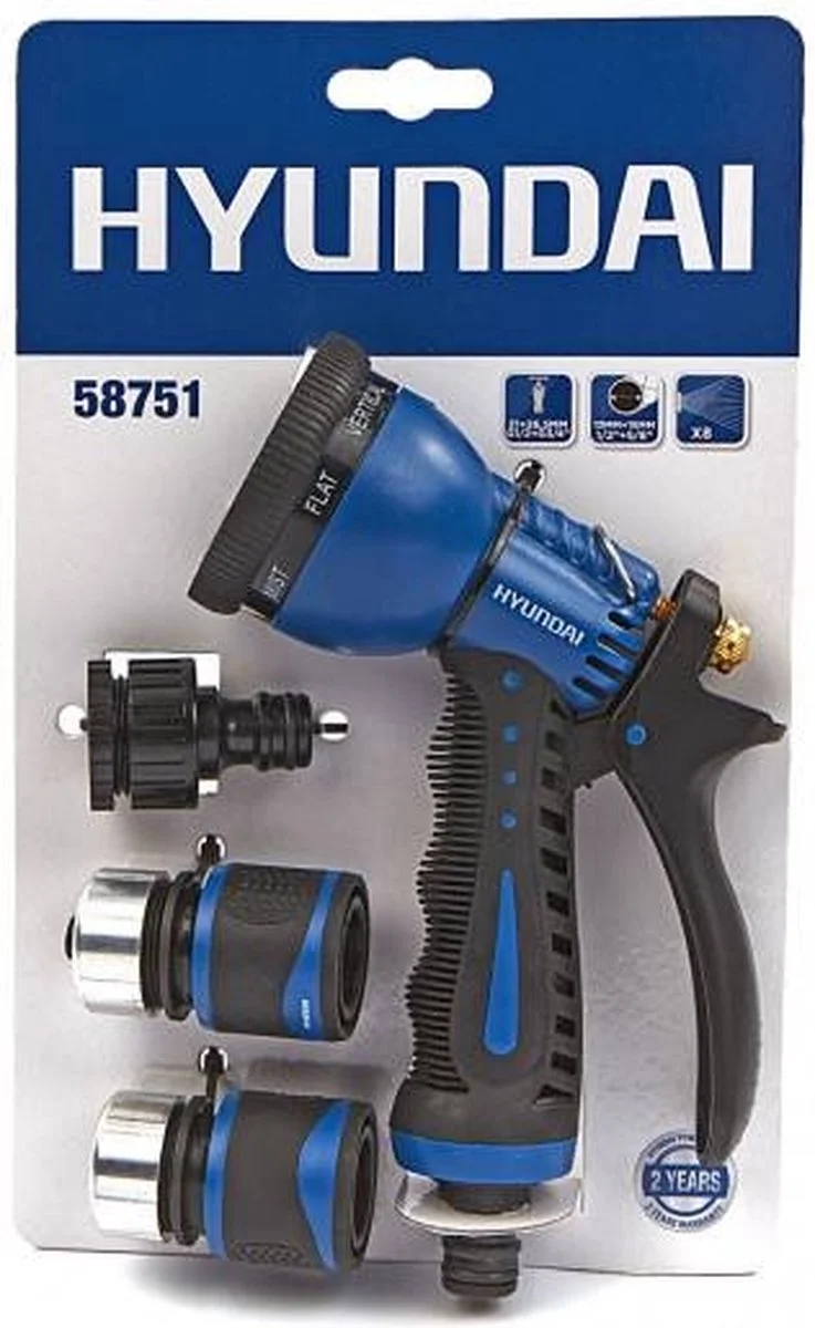 Deze 4-delige deluxe sproeiset biedt alles wat u nodig heeft voor besproeiingswerkzaamheden in en rondom uw tuin. Deze HYUNDAI sproeiset bevat een kraanstuk met adapter, een slangstuk, een slangstuk met waterstop en een deluxe sproeibroes, die eenvoudig op de kraan en slang te bevestigen zijn en is geschikt voor 13 mm (1/2) en 15 mm (5/8) slangen.De roestvrijstalen bevestigingsringen van de aansluit koppelingen zorgen voor een ultieme aansluiting van de slang op de kraan en sproeibroes en garanderen een langdurig gebruiksplezier. Trek je de aangesloten broes los van de slang, dan stopt de watertoevoer direct dankzij de waterstop.Door het ergonomische design ligt de broes comfortabel in de hand en hoef je je geen zorgen over vermoeide / verkrampte handen bij langdurig gebruik. Door de 8 verschillende stralen en de traploze instelbare straal is geen enkele taak te moeilijk en is deze binnen een handomdraai gedaan. Het veranderen van de straal gaat zeer gemakkelijk door te draaien aan de kop van de broes. Waterstraalvormen. -Broesstraal, miststraal, perlatorstraal, douchestraal, sproeistraal, reinigingsstraal, volle straal en vlakstraal.