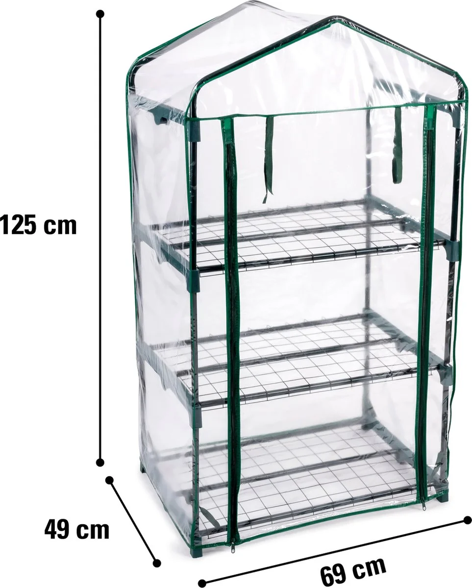 Met deze kas geef jij je kostbare en kwetsbare planten een veilige leefomgeving in je eigen tuin. Het waterdichte plastic zeil en de stevige constructie beschermen de planten namelijk tegen alle soorten weersomstandigheden. De kas wordt geleverd in losse onderdelen. Bijgevoegd zit een handleiding waardoor je hem snel en simpel in elkaar zet. De ingang van de kas heeft een ritssluiting. Daarnaast rol je de voorkant op voor gemakkelijke en snelle toegang. Dit model biedt ruimte aan veel van jouw planten door de 3 verschillende verdiepingen en een omvang van 69 x 49 x 125 centimeter. De kas is transparant, zodat ze genoeg zonlicht krijgen en je er van buiten alsnog van kunt genieten. Daarbij zorgen de donkergroene tinten ervoor dat hij in iedere tuin past. Jouw planten verdienen de allerbeste bescherming. Haal de specialisatie van Kinzo in huis.