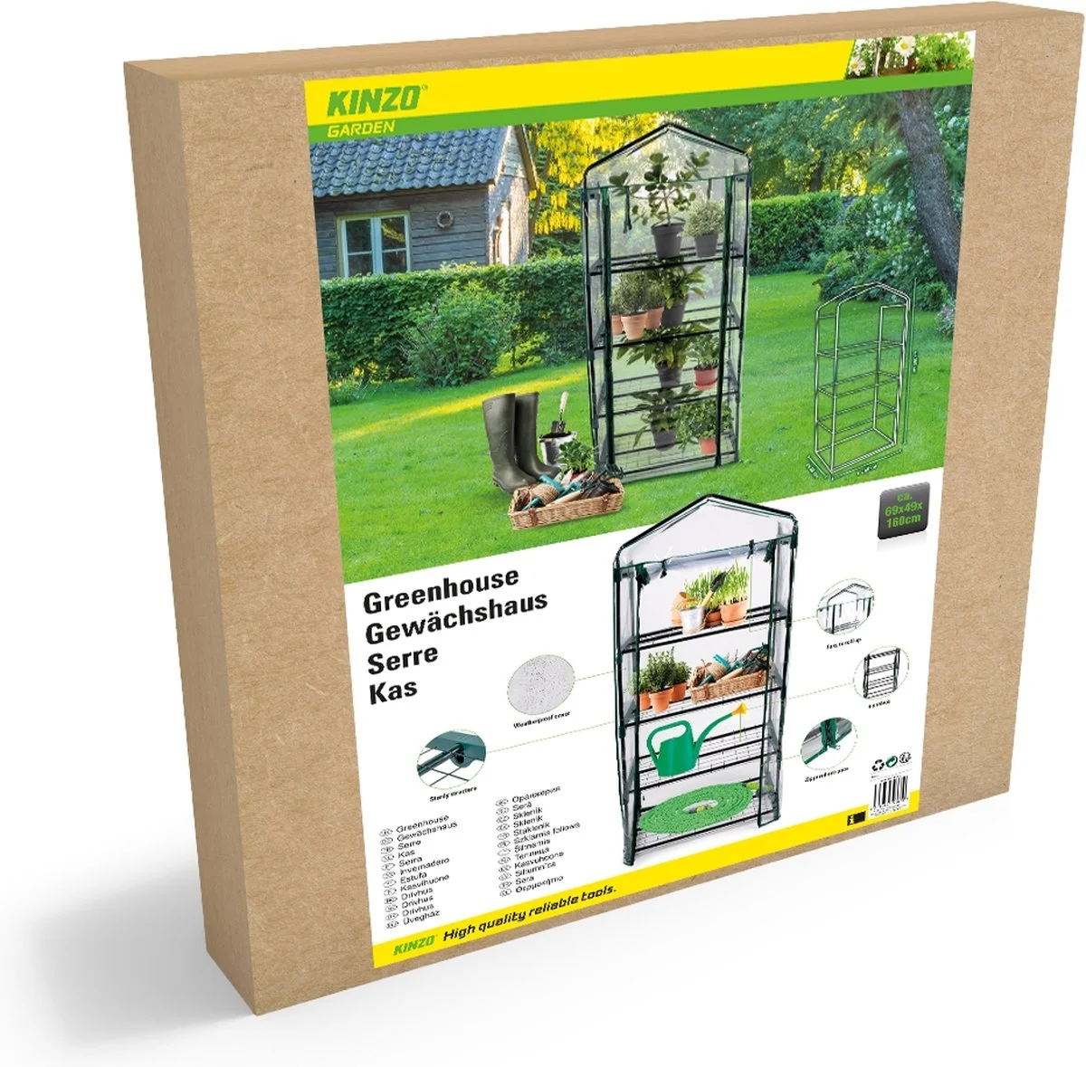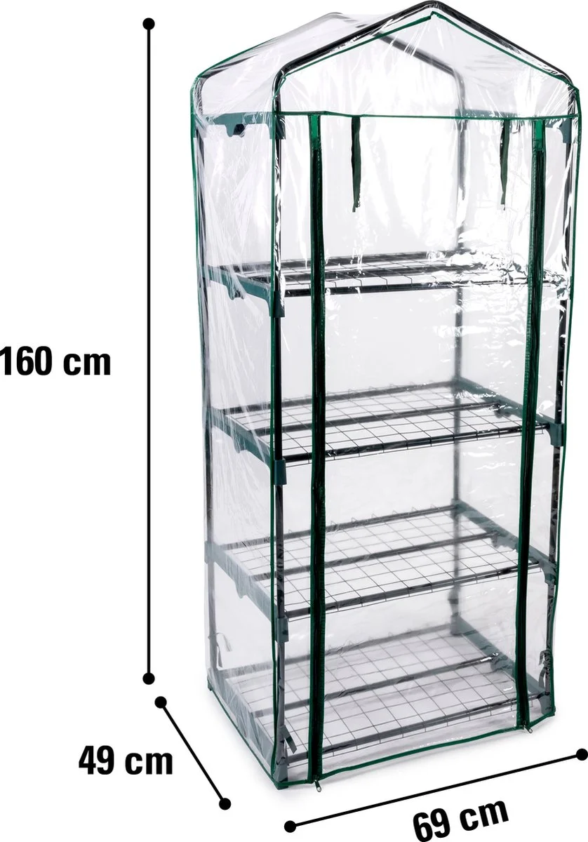 Met deze kas geef jij je kostbare en kwetsbare planten een veilige leefomgeving in je eigen tuin. Het waterdichte plastic zeil en de stevige constructie beschermen de planten namelijk tegen alle soorten weersomstandigheden. De kas wordt geleverd in losse onderdelen. Bijgevoegd zit een handleiding met overzichtelijke instructies, waardoor je hem snel en simpel in elkaar zet. De ingang van de kas heeft een ritssluiting. Daarnaast rol je de voorkant op voor gemakkelijke en snelle toegang. Dit model biedt ruimte aan veel van jouw planten door de 4 verschillende verdiepingen en een omvang van 69 x 49 x 160 centimeter. De kas is transparant, zodat je planten genoeg zonlicht krijgen. Daarbij zorgen de donkergroene tinten ervoor dat hij in iedere tuin past. Jouw planten verdienen de allerbeste bescherming. Haal de specialisatie van Kinzo in huis.>
